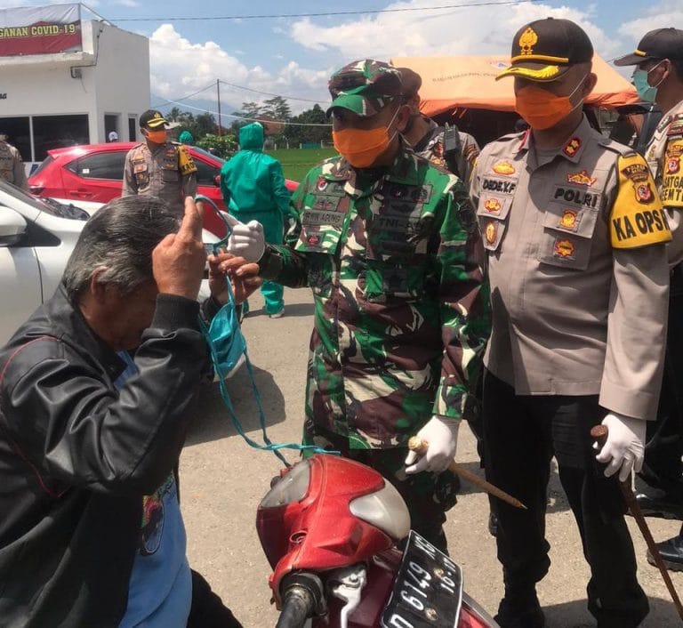 Kapolres bersama Dandim 0611 Garut membagikan masker di Pos Terpadu Pencegahan dan Penanganan Covid-19, Selasa (07/04/2020) di Pertigaan Jalan Baru Kadungora Kabupaten Garut Jawa-Barat.