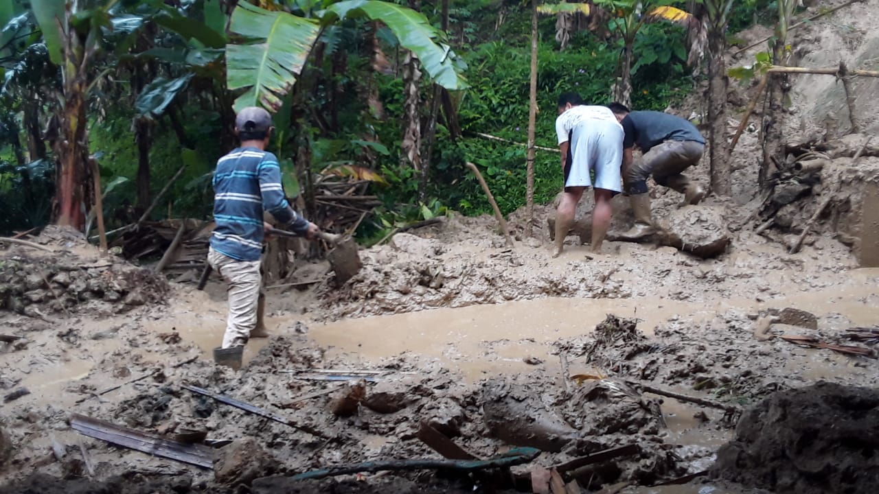 Hanya kerugian metrial saja tidak ada korban jiwa, kami sebagai Pemerintahan Desa setelah mengetahui terjadi bencana tersebut langsung terjun kelokasi membantu evakuasi dan juga turut serta membersihkan bekas-bekas longsoran bersama masyarakat setempat.