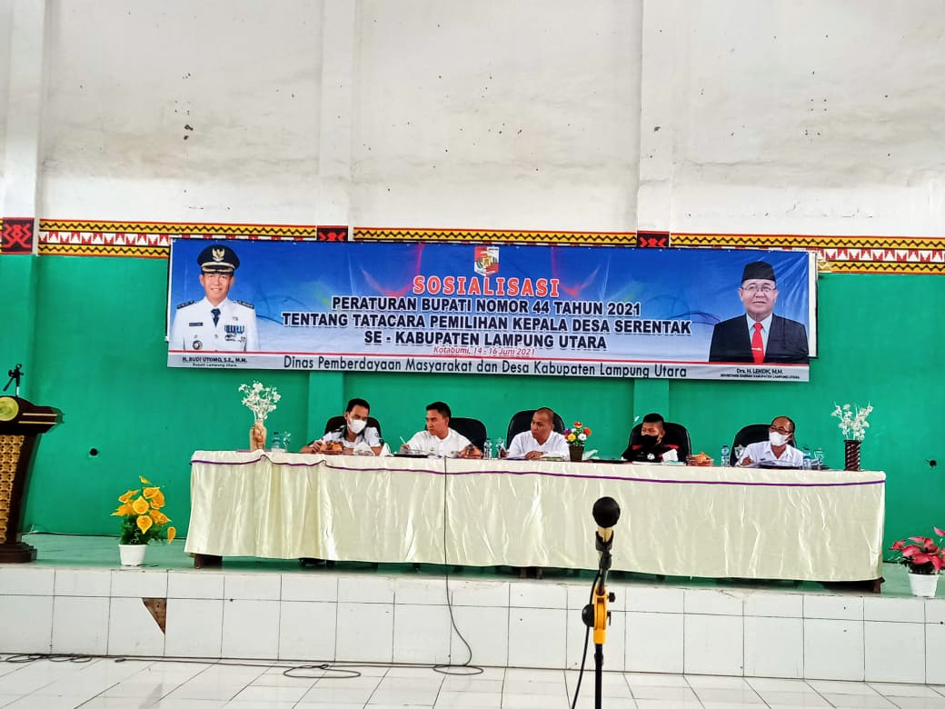 Asisten I Pemkab Lampung Utara mengatakan dalam pelaksanaan pemilihan Kepala Desa insya allah tanggal 9 November 2021, tujuan dari sosialisasi ini agar supaya perangkat desa dan kecamatan yang nantinya akan memberikan sosialisasi kepada panitia desa, tentang cara pemilihan kepala desa serentak di Kabupaten Lampung Utara,” tuturnya.