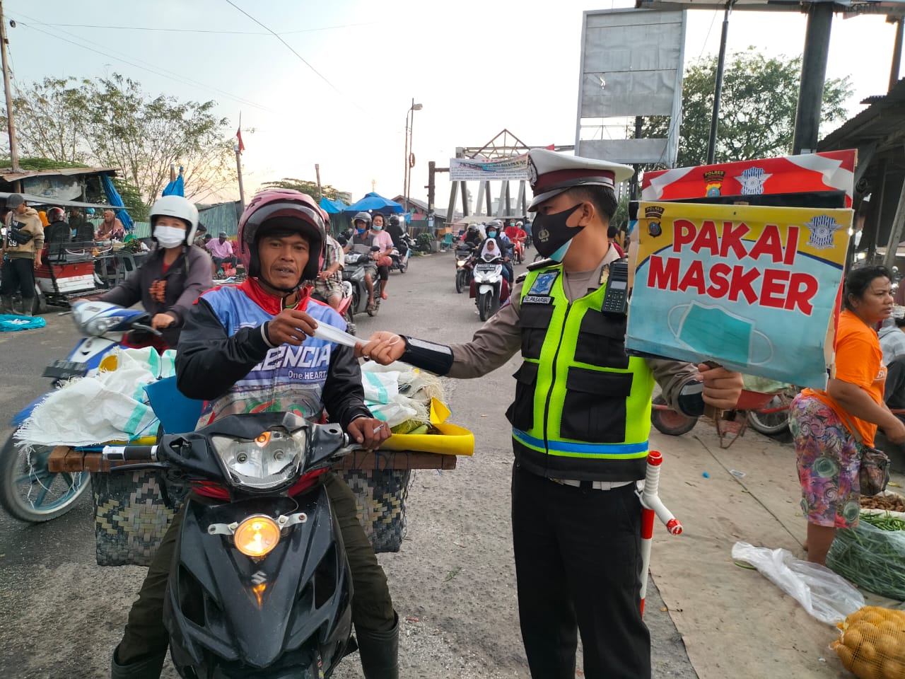 Satuan Lalulintas (Satlantas) Polres Tanjungbalai melaksanakan pembagian masker gratis kepada masyarakat di Jalan Gereja dan Pasar Veteran Kota Tanjungbalai, Rabu (23/2/2022) Pukul 08.30 Wib.
