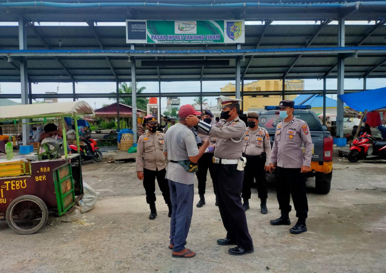 Personil Polres Batu Bara yang dipimpin oleh KBO Sat Lantas IPTU JA. MANURUNG melakukan Operasi Yustisi Pembagian Masker Kepada Masyarakat yang berada di wilayah Tanjung Tiram, Kabupaten Batu Bara, Jumat (18/3) sekira Pukul 09.00 wib.