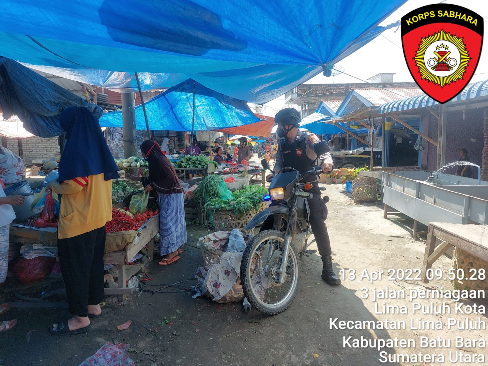 Antisipasi tindak kriminalitas sekaligus pencegahan penyebaran Covid-19, Personil Patroli sat Samapta Polres Batu Bara melaksanakan giat patroli dialogis serta menyampaikan edukasi prokes di pasar Tradisional Lima Puluh, Kecamatan Lima Puluh Kabupaten Batu Bara. Rabu, (13/04/2022).