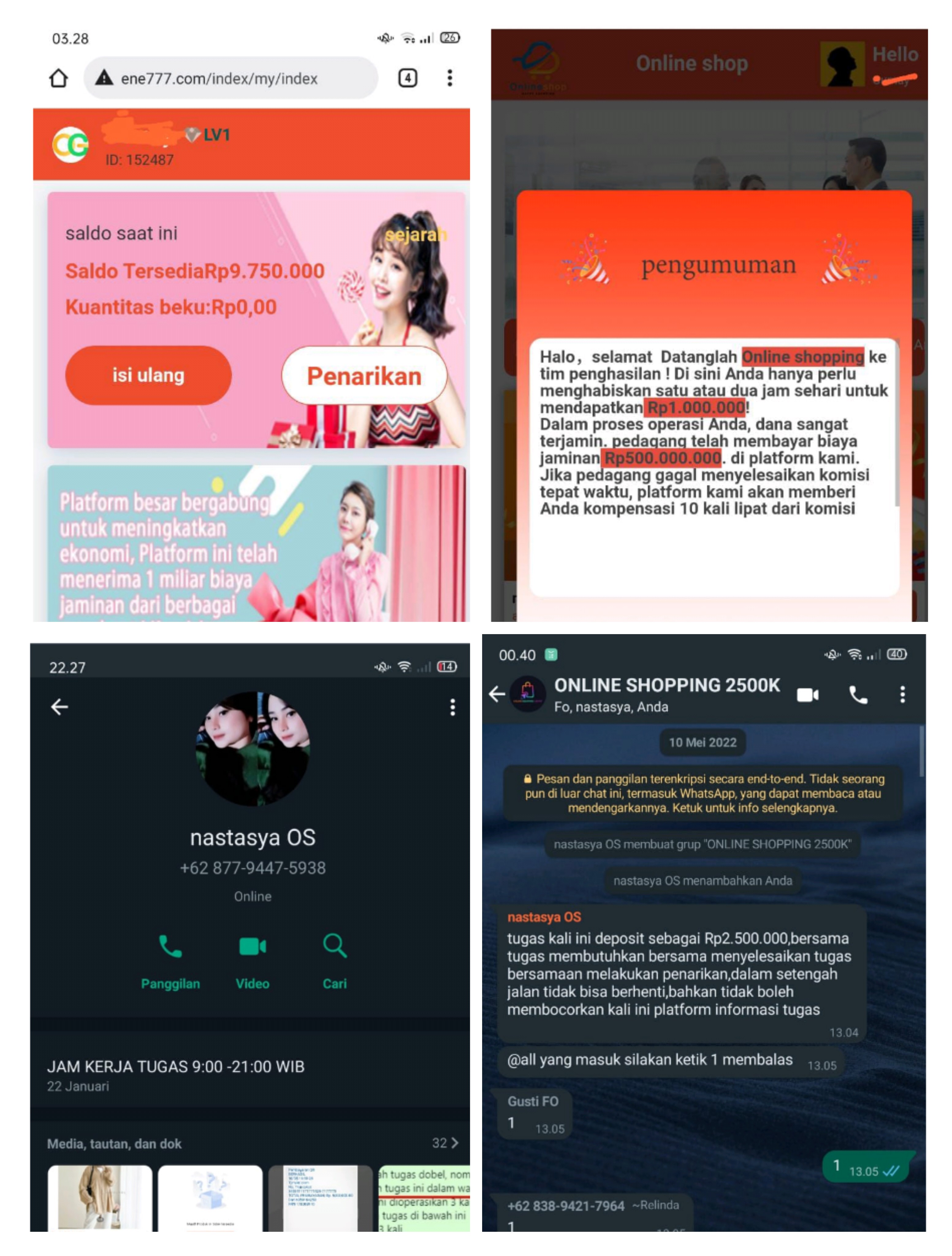 Korban dimasukan dalam group WhatsApp dengan member sebanyak 100 orang. Didalam group banyak sekali yang melakukan transaksi tersebut dan akhir nya semakin mempercayai korban untuk bisa top up besar dalam akun agar semakin besar juga mendapatkan komisi.