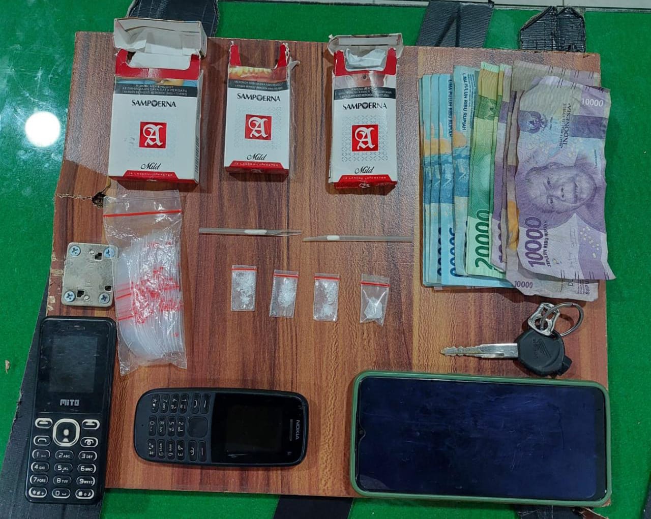 “Pada saat dilakukan penangkapan, para pelaku sempat berusaha melarikan diri. Namun berhasil diamankan petugas yang kemudian dilakukan penggeledahan badan dan tempat, kemudian di dapati 1 palstik klip disimpan di kotak rokok di duga narkotika jenis sabu dan di lakukan penggeledahan lagi di sekitar TKP di temukan 3 plastik klip diduga narkotika jenis sAbu di simpan di dalam kotak rokok yang di sembunyikan di pot bunga,” ungkap Kapolres.