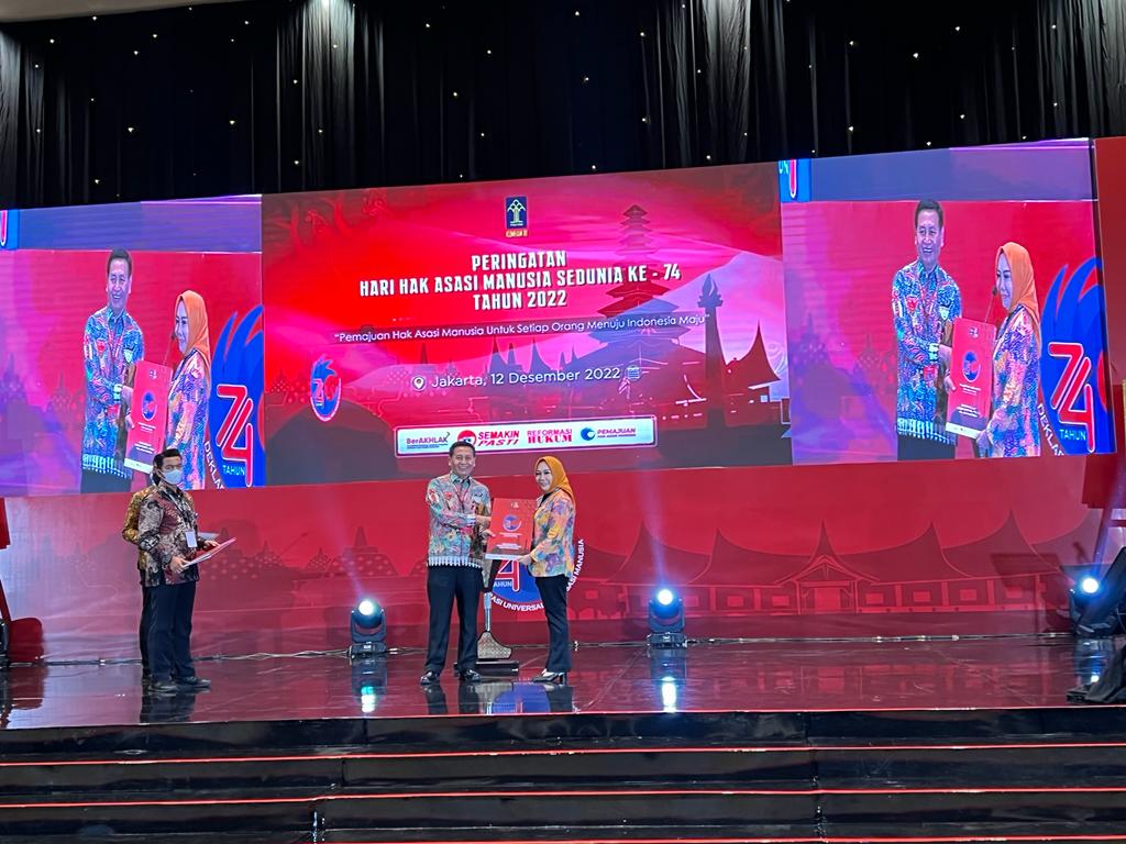 Panaragan – lensaexpose.com -Pemerintah Kabupaten Tulang Bawang Barat menerima penghargaan sebagai Kabupaten Peduli Hak Asasi Manusia (HAM). Menteri hukum dan HAM Prof. Yasonna H. Laoly, S.H., M.Sc., Ph.D yang diwakili Plt. Dirjen HAM Mualimin Abdi, S.H., M.H. menyerahkan langsung penghargaan tersebut kepada Penjabat Bupati Tulang Bawang Barat Dr. Zaidirina, S.E yang didampingi oleh Kabag Hukum Setdakab Tulang Bawang Barat Budi Sugiyanto, S.H., M.H. pada Peringatan Hari Hak Asasi Manusia (HAM) Sedunia ke-74 di Golden Balroom Hotel Sultan & Recidence Jakarta Pusat, Senin (12/12/2022).