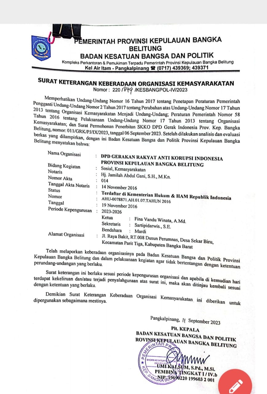 Berdasarkan PP no 58 tahun 2016, tentang pelaksanaan UU no 17 tahun 2013 tentang organisasi kemasyarakatan, pertanggal 11/9/2023 Kesbangpol Provinsi Kepulauan Bangka Belitung telah menerbitkan SKKO DPD GERAK (Gerakan Rakyat Anti Korupsi) Indonesia tanda telah dilakukannya analisa dan evaluasi berkas administrasi.