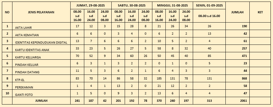 Hasilnya, sebanyak 2.061 layanan adminduk berhasil diselesaikan selama kegiatan berlangsung, seperti yang terlampir pada tabel berikut :