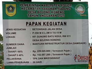 “Pembangunan Betonisasi jalan lingkungan dengan menggunakan anggaran dana Bankeu, Pemerintah Desa, Bojongkoneng Bangun Terus Untuk Penunjang Aksesibilitas Warga. Sumber Anggaran Bantuan Keuangan Infrastruktur dana Bankeu tahun anggaran 2025.